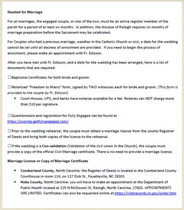 Para todos los matrimonios, la pareja comprometida, o uno de los dos, debe ser un miembro activo y estar registrado en la parroquia por un período mínimo de seis meses. Además, la diócesis de Raleigh requiere seis meses de preparación matrimonial antes de que se pueda celebrar el Sacramento.